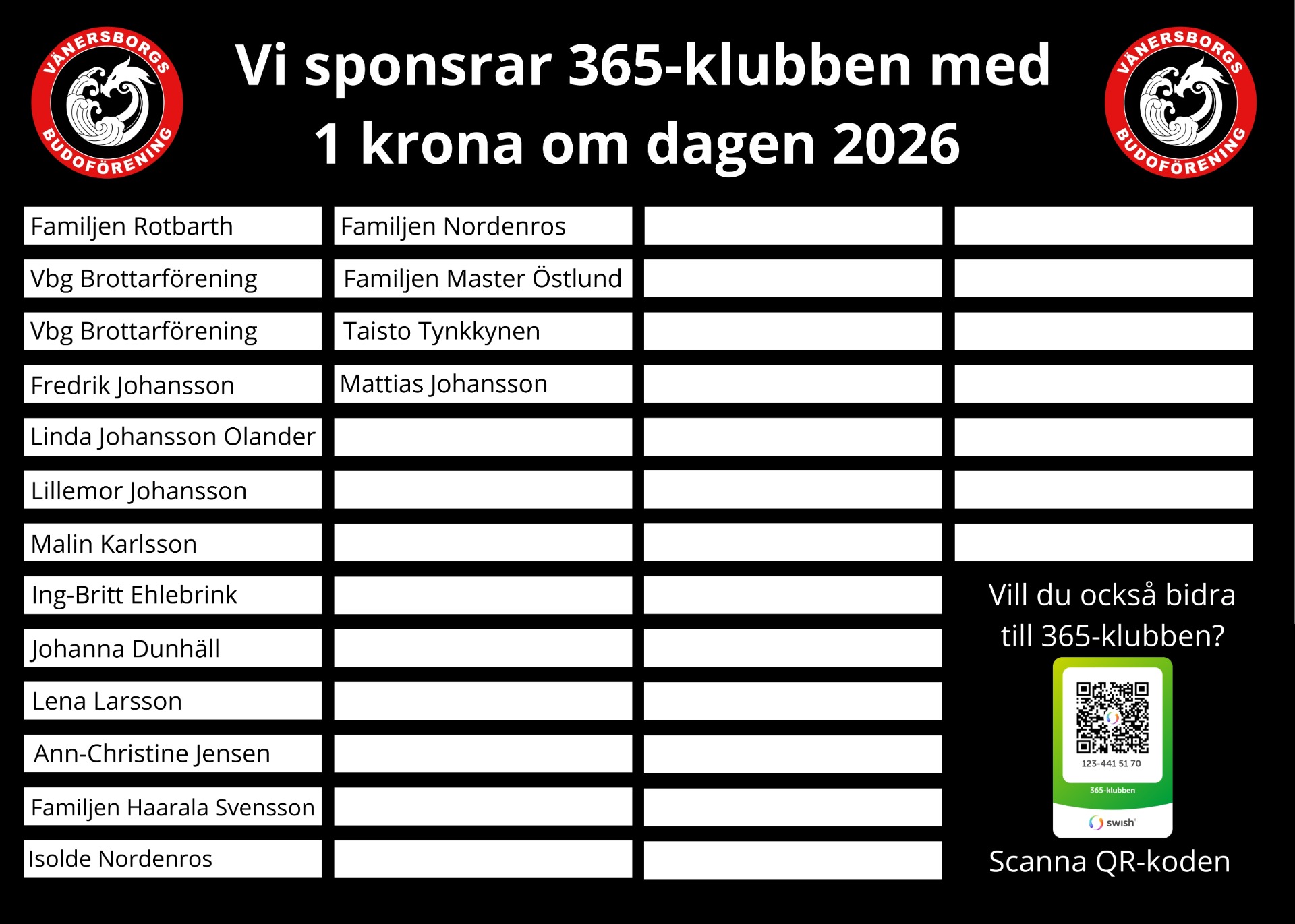 Som tack uppmärksammas alla som stödjer 365-klubben med sitt namn på vår skylt i lokalen samt här på hemsidan.